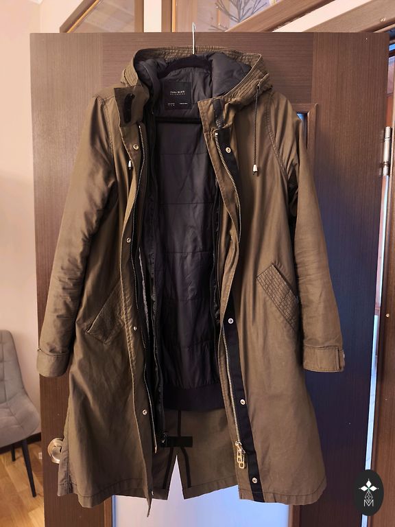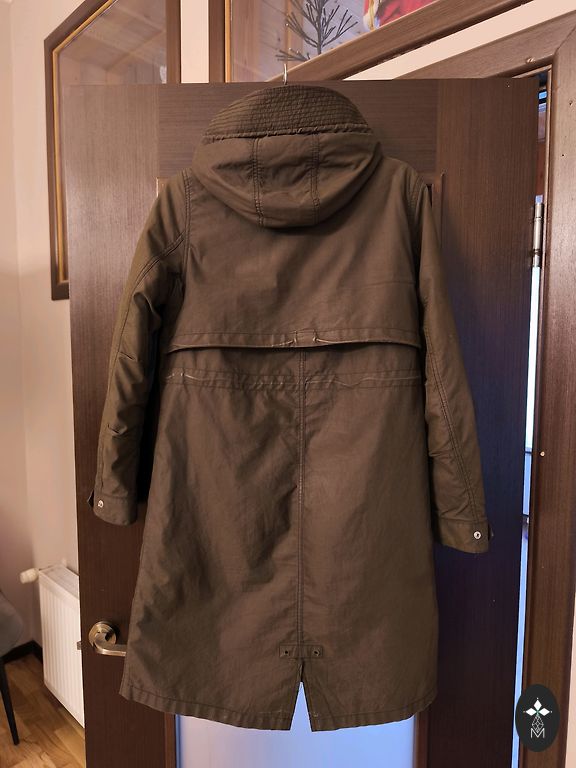 Pečiai 50 cm, krūtinė 110 cm, rankos ilgis nuo peties 68 cm, pilnas ilgis nugaroje 76 cm, priekyje 72 cm.