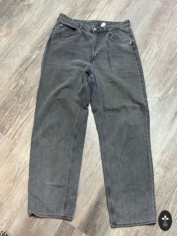 Gaiši pelēkas platās džinsenes, uzvilktas vien pāris reizes, lai saprastu, ka nav priekš manis. Augstais viduklis, apkārtmērs 90 cm, gurnu apkārtmērs 108 cm, garums 97 cm, audums nav elastīgs.