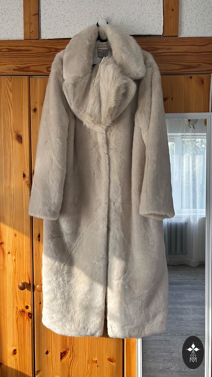 mētelis no mākslīgās kažokādas, liela kapuce, garums 90 cm