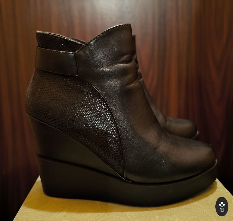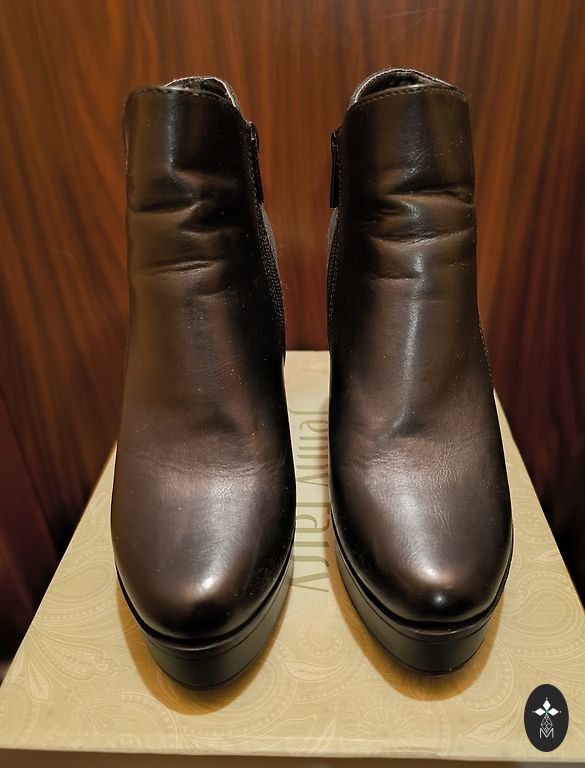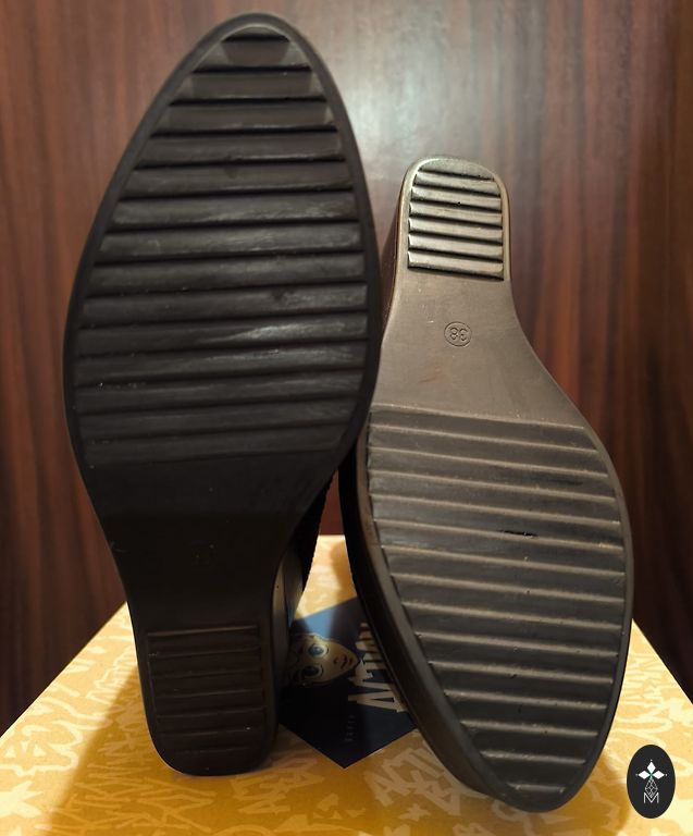 Seemisnahk+kunstnahk, mugav liist. Sees on katte varbal veidi pragunenud, see ei mõjuta (näha fotol). Vajadus kontsaplekkide vahetamiseks (näha fotol) 24cm sisetald, stabiilne 38 suurus.