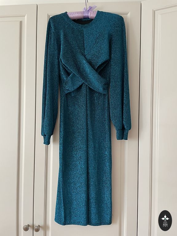 Roheline veniv kleit kolme neljandiku pikkuste varrukatega ja pitsiga seljaosaga. Elegantne, sobib pidulikeks sündmusteks. Suurus XS.