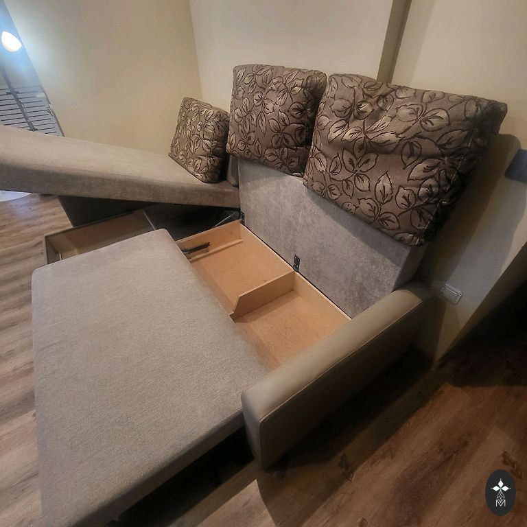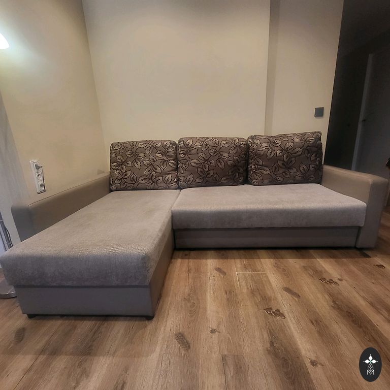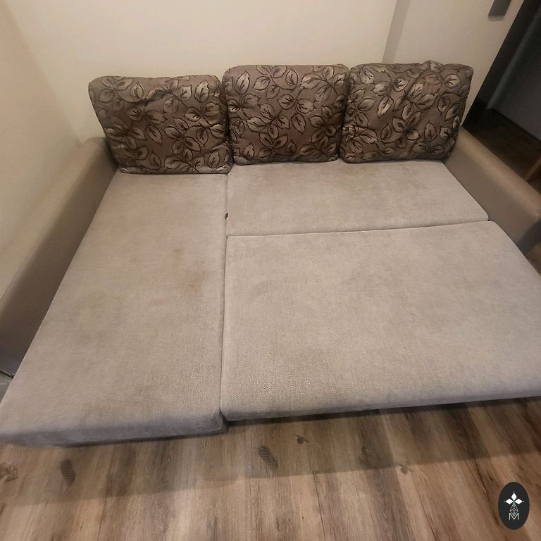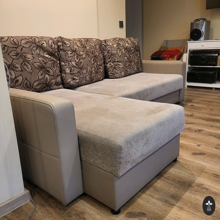 После чистки. Натуральная кожа, нубук - легко ухаживать и не холодный при сидении. Прочная деревянная рама внизу. Не выдвигается. Произведено в Финляндии. Находится на 0 этаже у земли. 140x85см