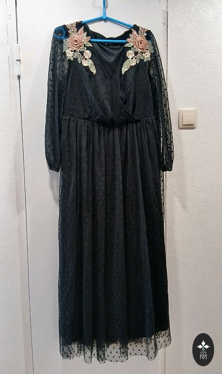 Eleganta kleita saviesīgiem pasākumiem, kleitai apakšmalā ir volāns ar zelta krāsas dekoriem, tādi paši dekori krūšu daļā. Kleitas izmēri - krūtīs 70 cmx2, gurnos 70 cmx2, piedurknes - 31 cm, kleitas garums 143 cm, izsūtu ar Omnivu, sūtīšanu sedz pircējs, klātienē netiekos.