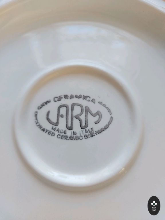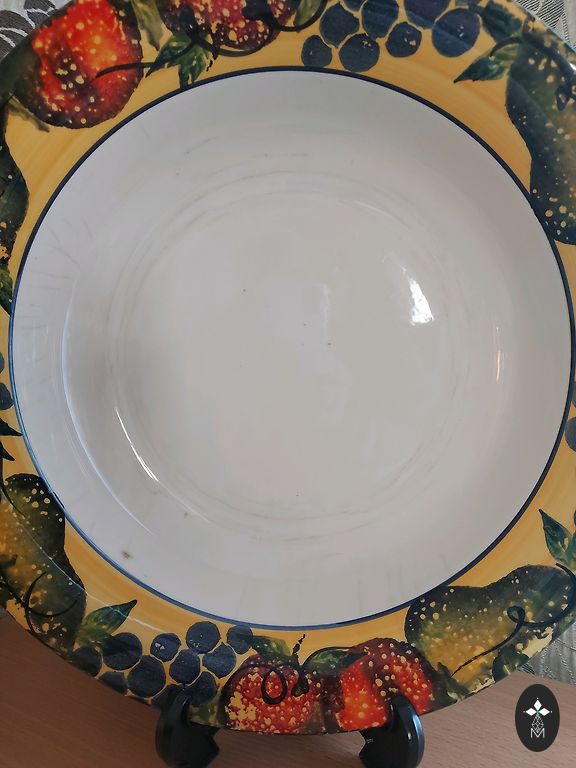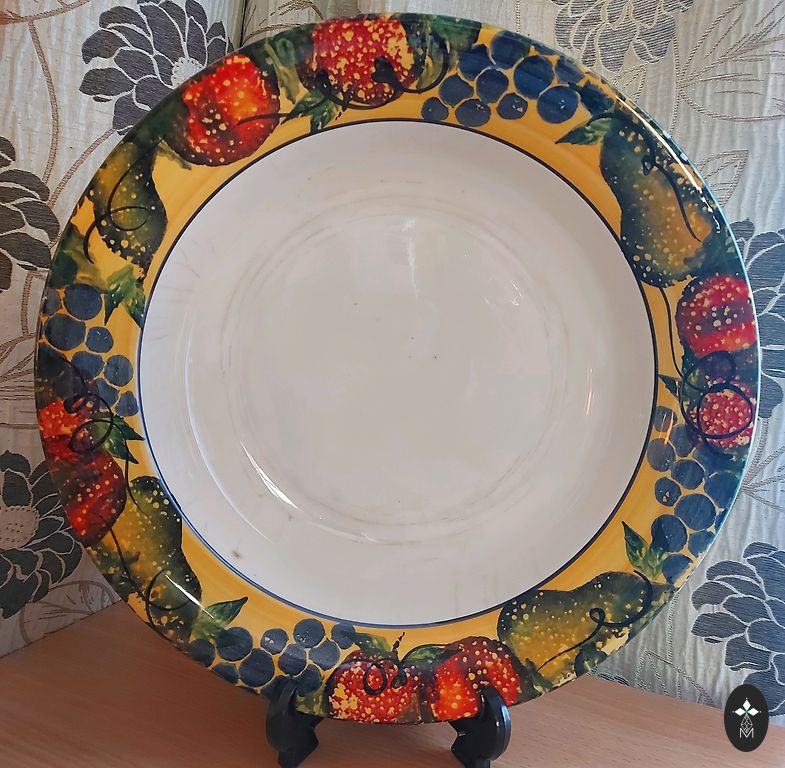 RPF старинная детская тарелка D29см. Есть признаки использования (царапины на глазури, износ золотого покрытия) и небольшие производственные дефекты (вмятины на глазури, черная точка).