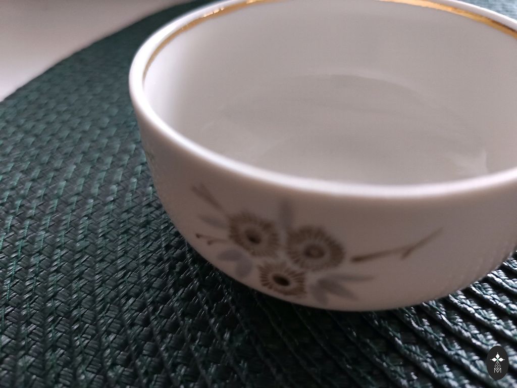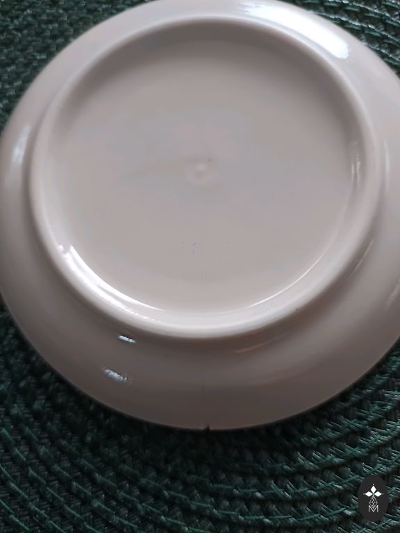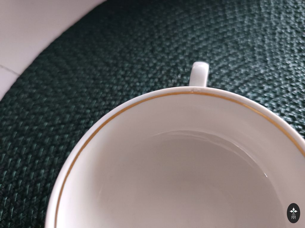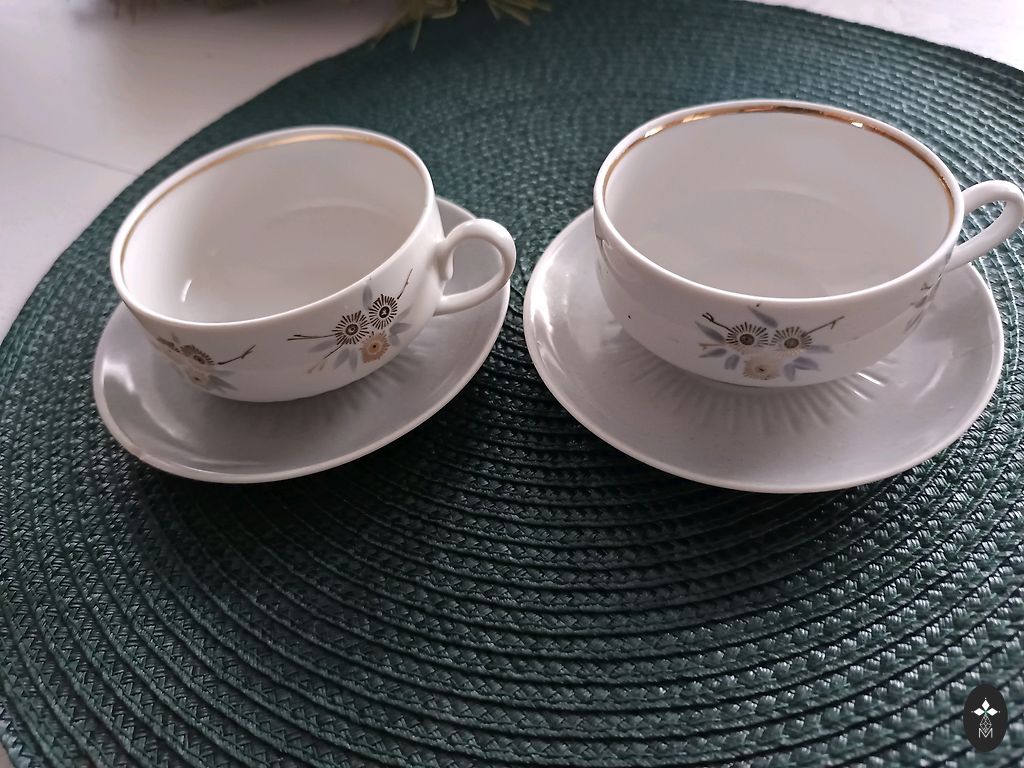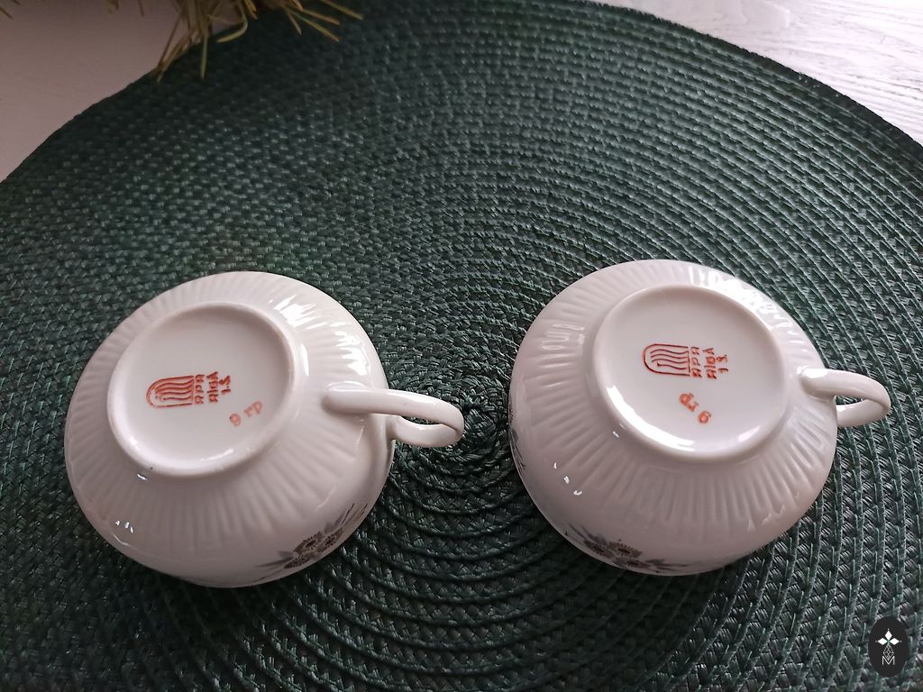 Ir daži defekti. Tasītei uz apakšas nošķēlums un divām apakštasītēm uz apakšmalas nošķēlums. Nedaudz padilusi zilā līnija uz apakštasēm. Komplektācija redzama bildēs.
