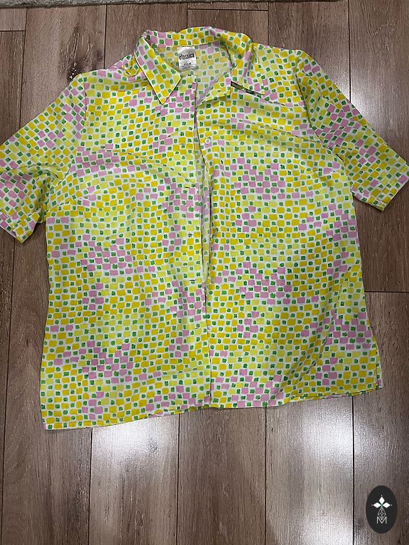Eestikeelne tõlge: Nööbitav ees, elegantne, suvine, saab kanda nii õlalt kui ka õlal. Volangidega kohev varrukad. 60% linane, 40% viskoos. Rinnaümbermõõt 52cm, pikkus 34cm.