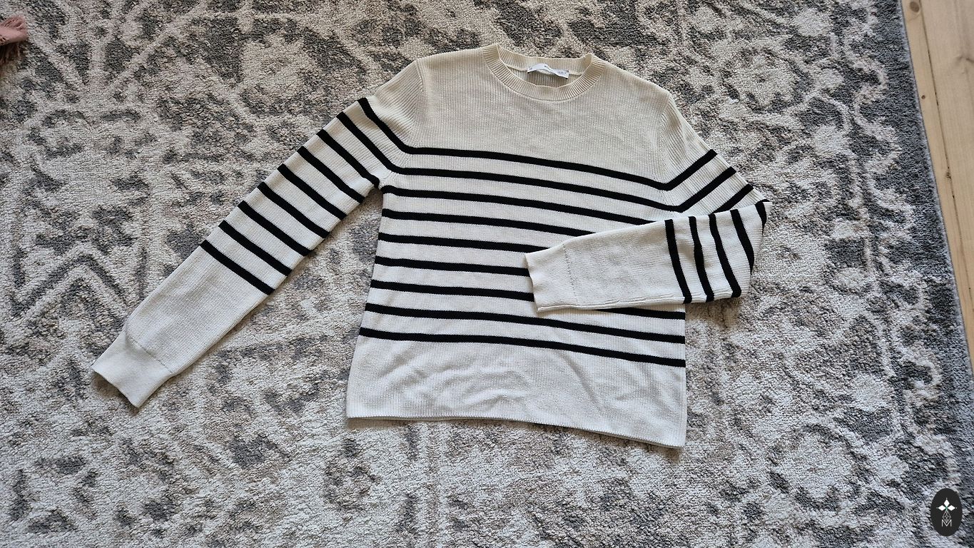 Norādīts S, meita vilka uz XS. Derēs arī M, tikai tad nebūs brīvs, bet gan uz auguma. Vilkts maz, pūka nav savēlusies. Vienīgais "defekts" ir atplīsis augšējais striķītis, aiz kā aizkabina āķīti. Viegli labojams. Sūtu ar Omniva, vai dpd.