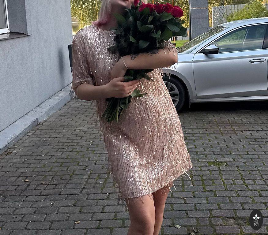 Spalva: tamsiai mėlyna su aukso gėlių motyvu sijono dalyje. Ilgis iki kelių. Platesnė sijono apačia su įsiūtu tinkliuku – puikiai išryškina liemenį ir suteikia moterišką siluetą. Dydis: nurodytas 1 (atitinka 40–42)