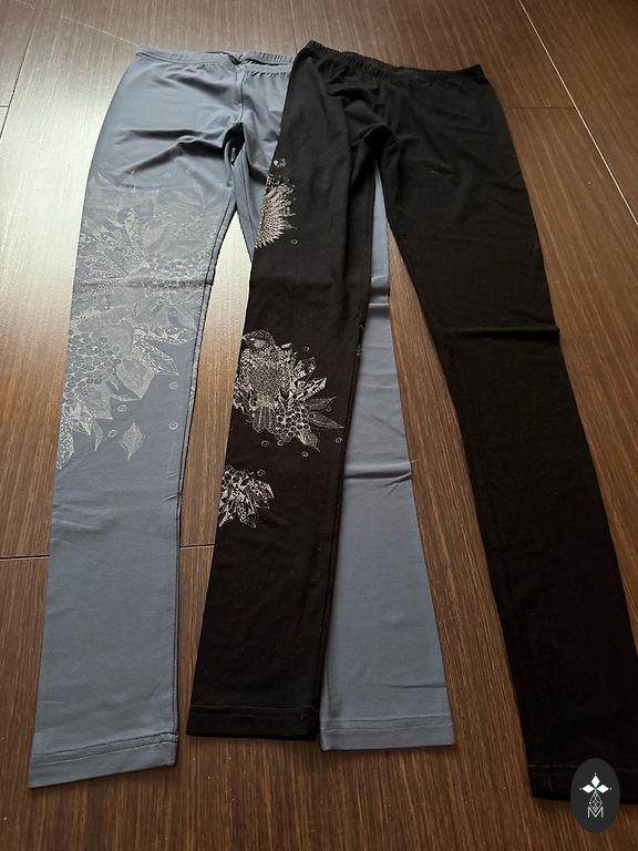 Legingi lieliskā stāvoklī, ar elastānu pabiezi, bet ērti. Metāliskas kniedītes.