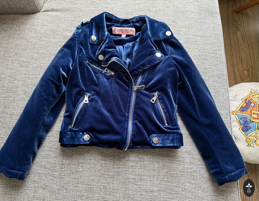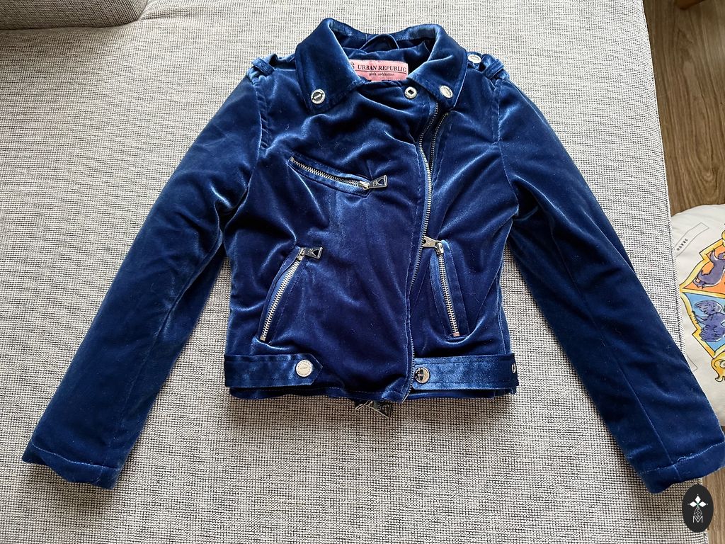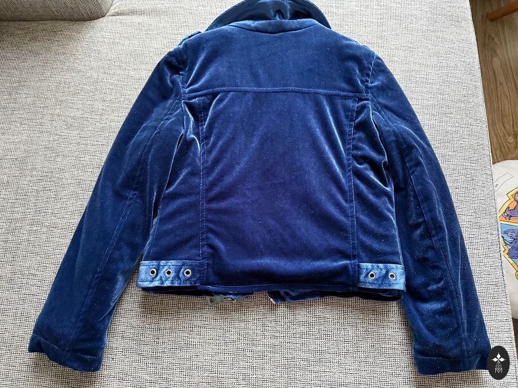 A beautiful dark blue jacket with a metallic sheen. The outer material is rain and wind resistant. Drawstring waist. The only flaw is a few small creases in the lining (see last photo). No other flaws!