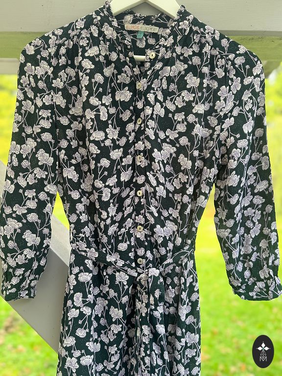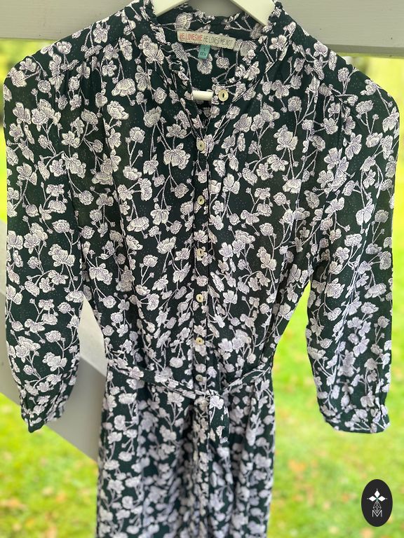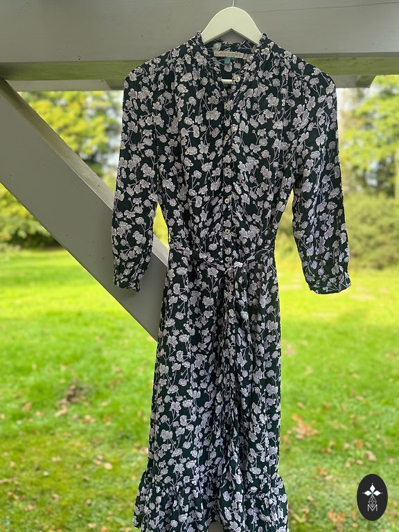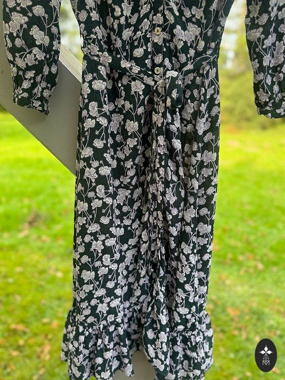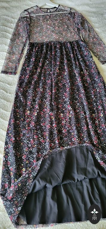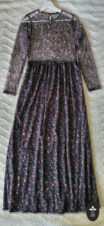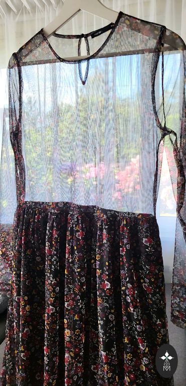Garā ELLOS kleita ar ziediem. Materiāls pilnībā elastīgs. Zem krūtīm sasienama jostiņa. Sānos apakšā nelieli šķēlumi.