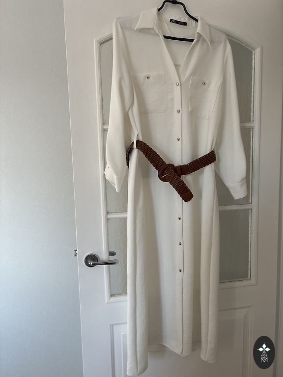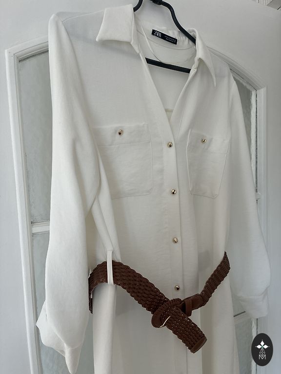 Norādīts 42izm, bet labāk būs uz M, mazu L. Elastīga,krūtīs 90-98cm, viduklī 72-78cm, gurnos 96+, garums 100cm.