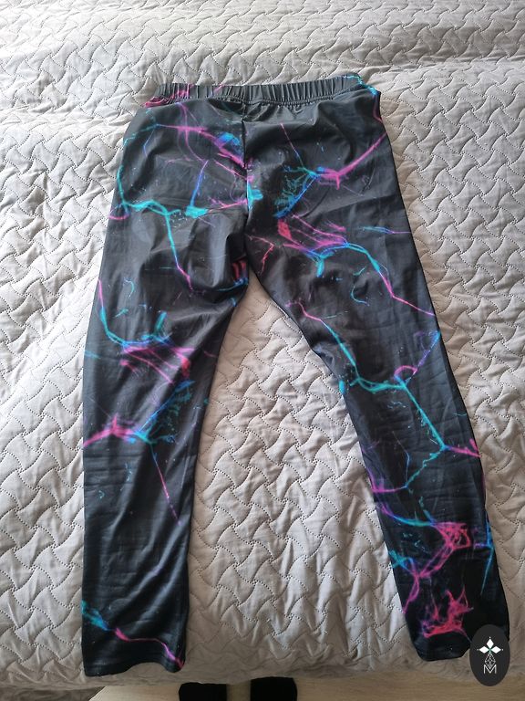 Брюки как леггинсы, немного растянутые, не ношеные, но бирка оторвана. Материал 92% полиэстер, 8% эластан. Резинка на талии, пояс 39-44 см, бедра 49 см, длина 95 см.