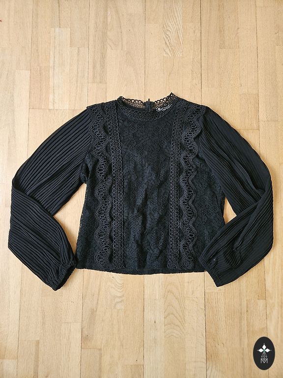 Dark blue. Fabric combined (knitwear/satin, composition visible in photo 4. Size 42. Parameters: shoulders 39, length 58. Lace at the back (lace is more clearly visible in photo 3 against a white fabric background). Decorated with crystals. Will look good at festive occasions.