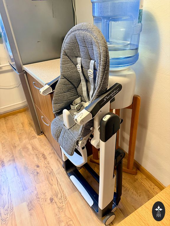 Sėdynė turi 9 reguliuojamas aukščio pozicijas nuo gulimos iki sėdimos. Sėdynė turi 5 atlošo nuolydžio pozicijas. Reguliuojamas kojų atramas. Dviguba nuimama padėklė. Kompaktiška ir stabili sulankstytoje būsenoje. Ratukai nesubraižo paviršiaus. Sėdynė lengvai prižiūrima, geros būklės.