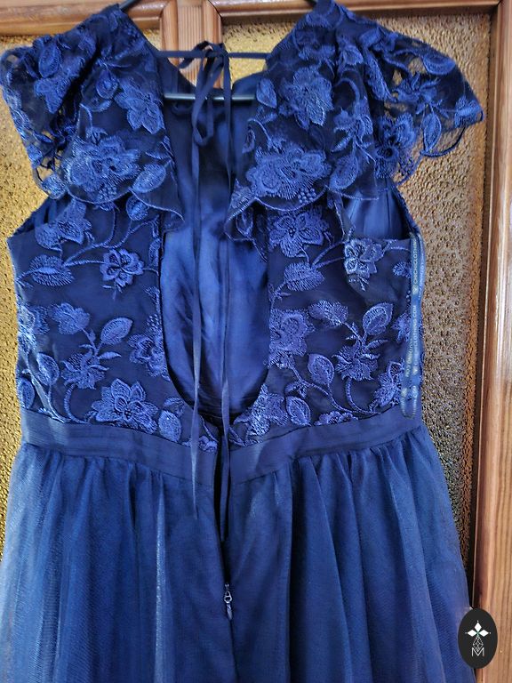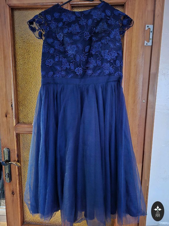 Tumesinine kerge satiinitooniga. Istub hästi figuurile, ei kortsu. Näeb hea välja koos mõne ruudulise jakiga.