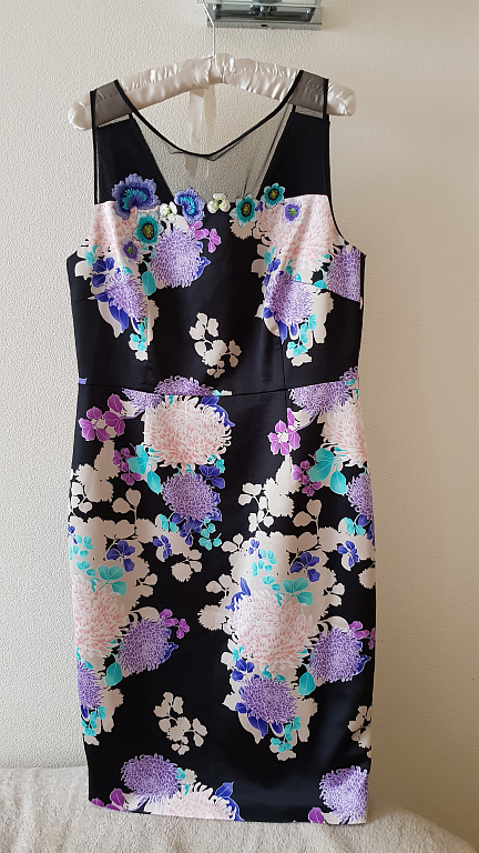 Must lillemustriga M/40 suuruses kokteilikleit. Pealispinnal läbipaistev tüll lillemustriga, alusseelik must õlapaeltega. Vöökohas liibuv musta seotava vööga, vöökohast kellukesekujuline laienemine. Tagaosa tõmblukk ja nööp. Pikkus 105 cm.
