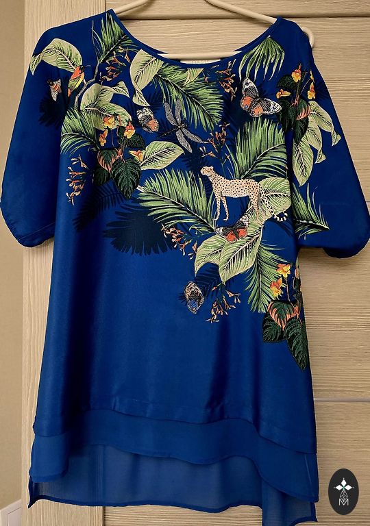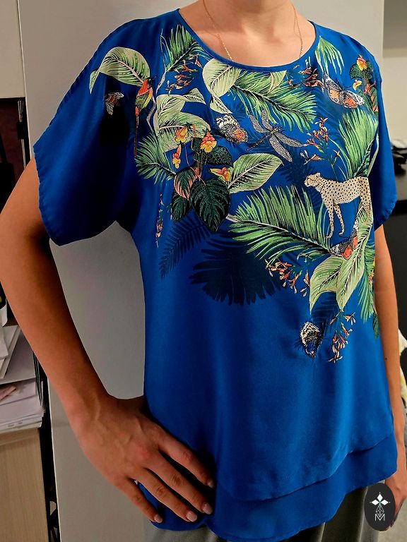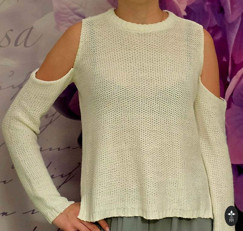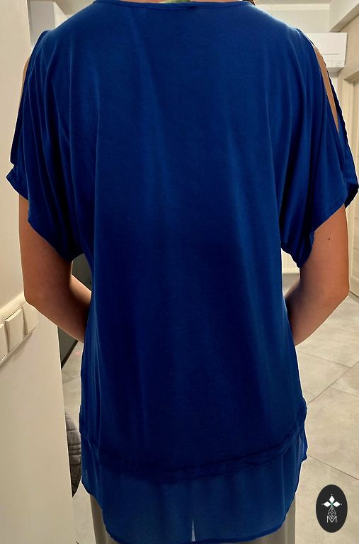 Dizaino megztinis su audinio siūlėmis ant rankų ir megztinio apačioje. Tinka S-M dydžiui. Tamsiai mėlynas.