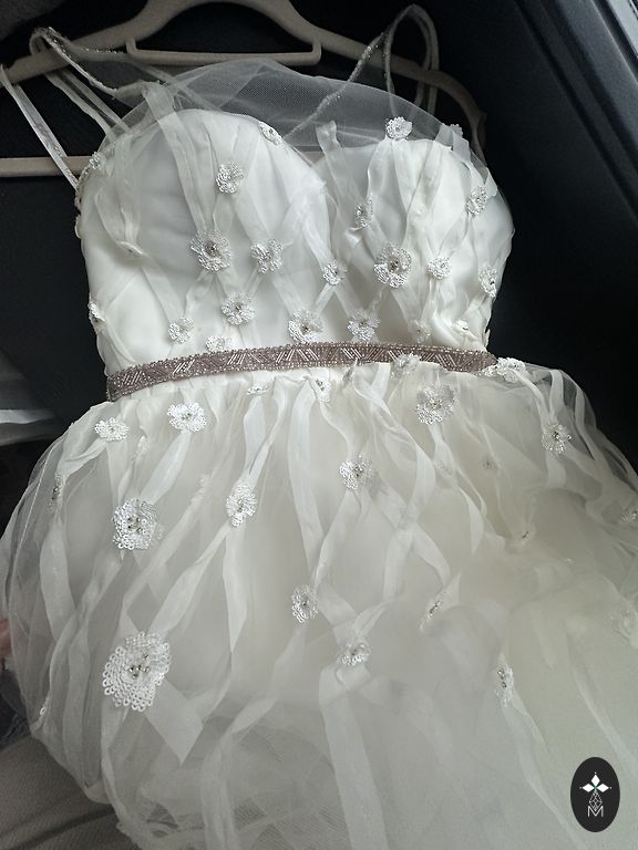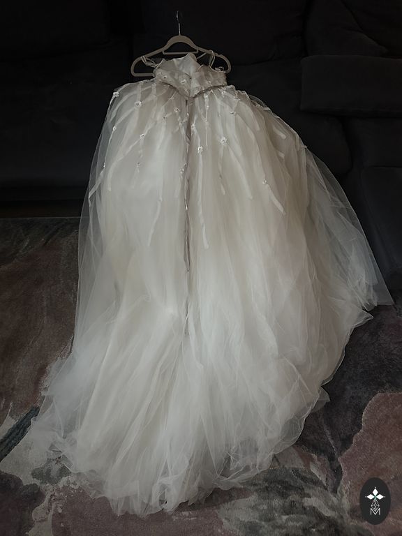 Форма платья и дизайн как здесь по ссылке, но сверху три тонких слоя тюля и без корсета, но с кружевом.