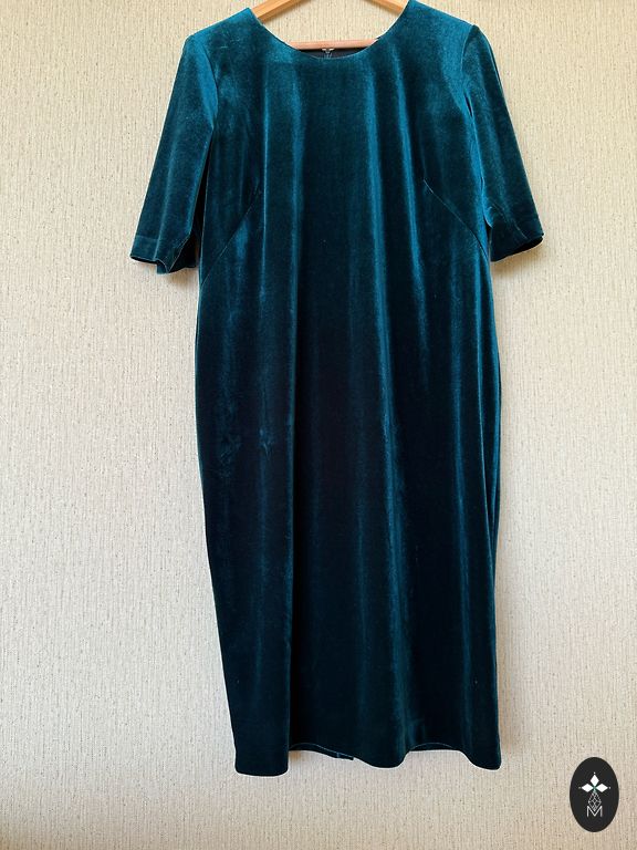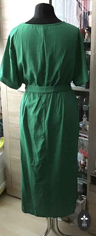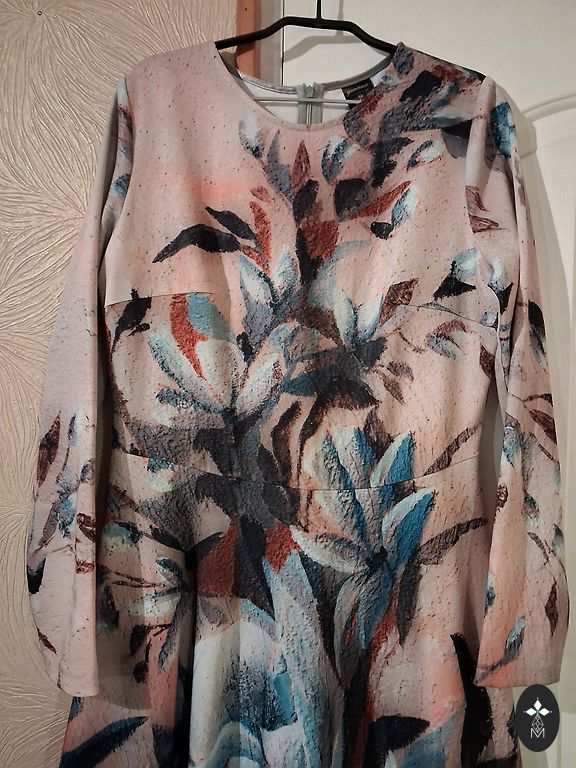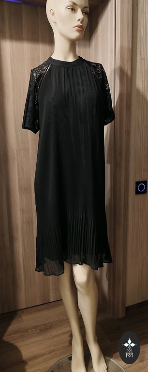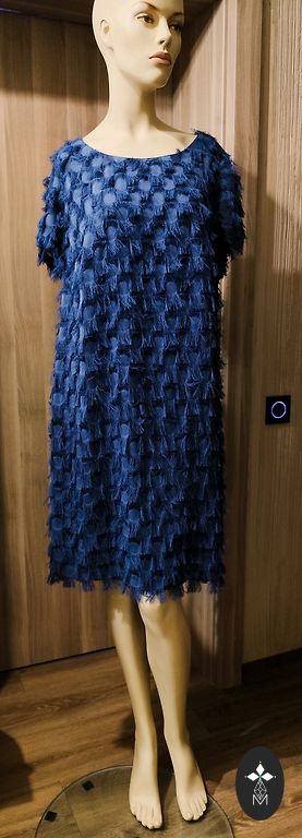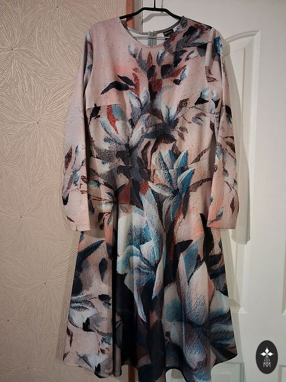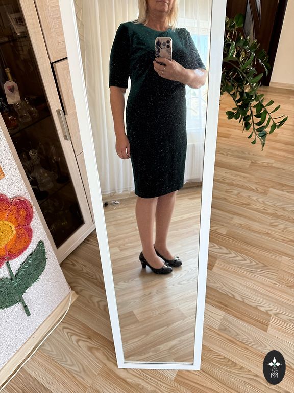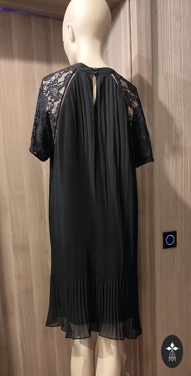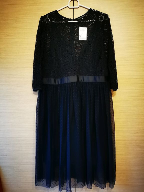 Festive dress, lined at the top, side zipper, flowing material. Bust circumference 110cm, waist 98cm, hips 150cm, length 108cm.