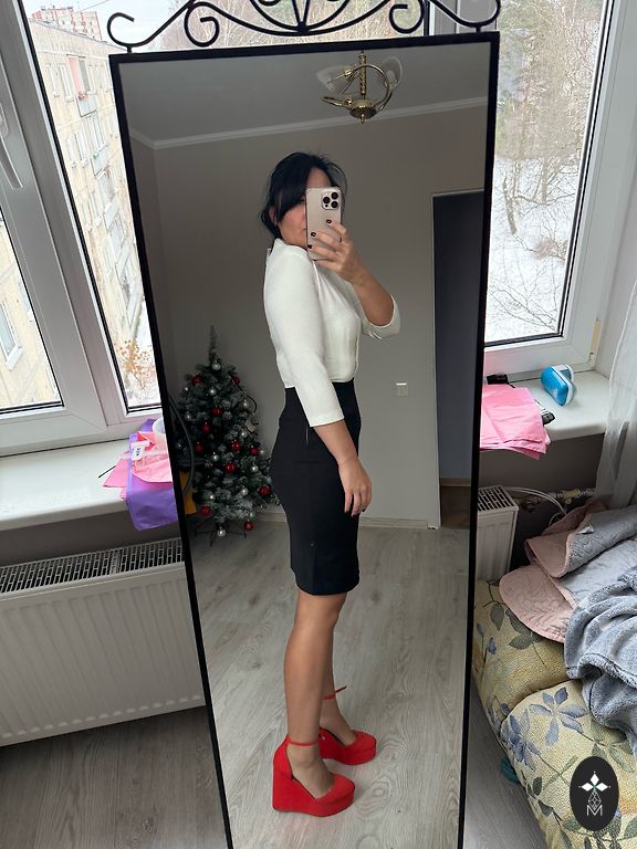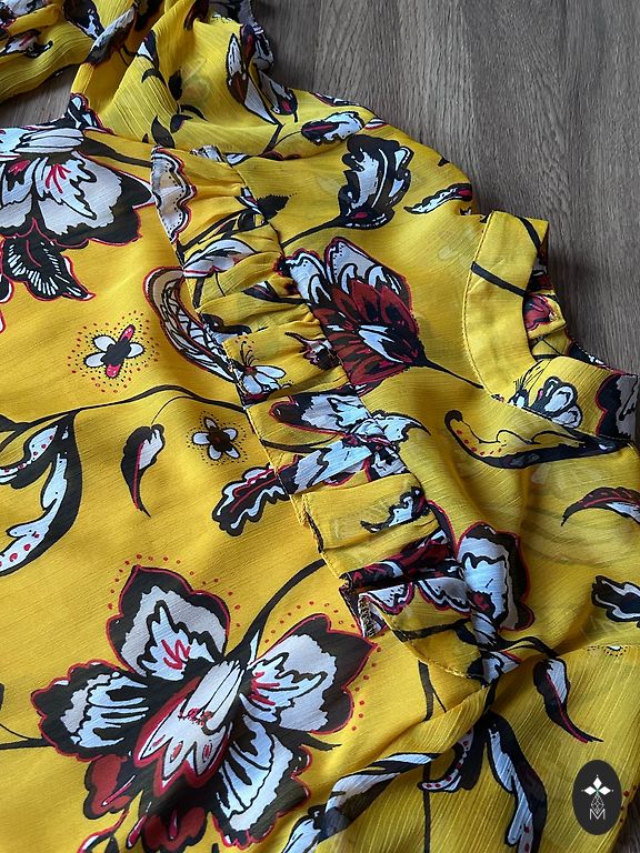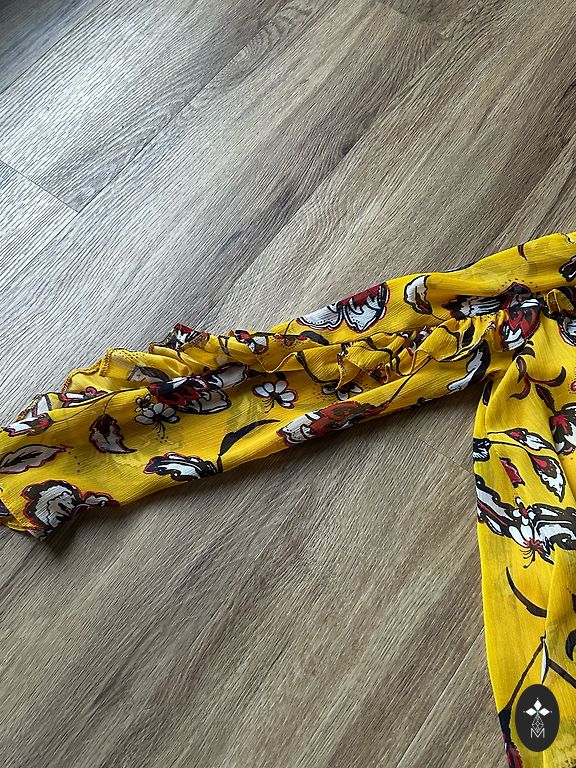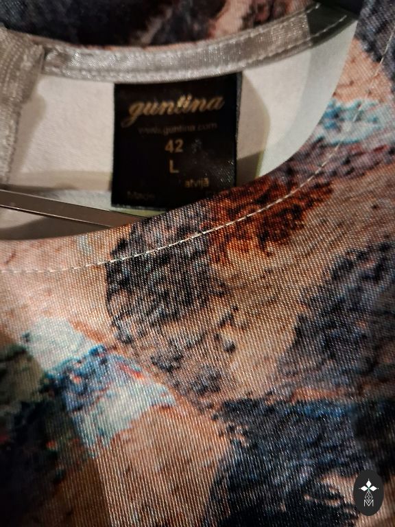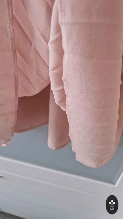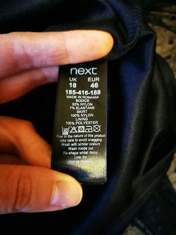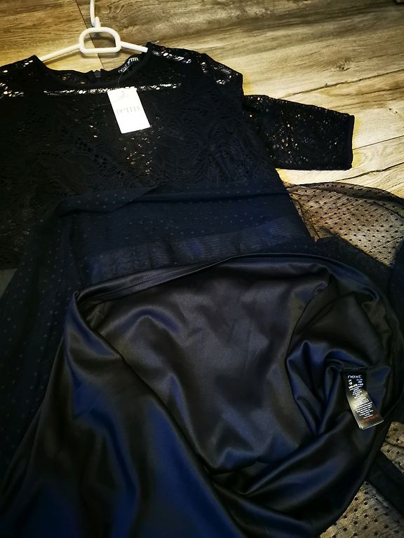 Festive dress, lined at the top, side zipper, flowing material. Bust circumference 110cm, waist 98cm, hips 150cm, length 108cm.