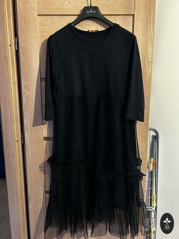 Viscose with elastane lining, polyester outer material. Bust 100, hips, length 94cm. Fine pleats.