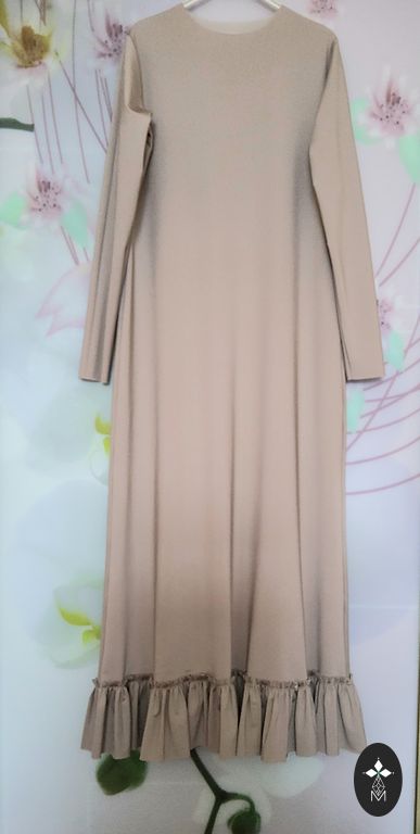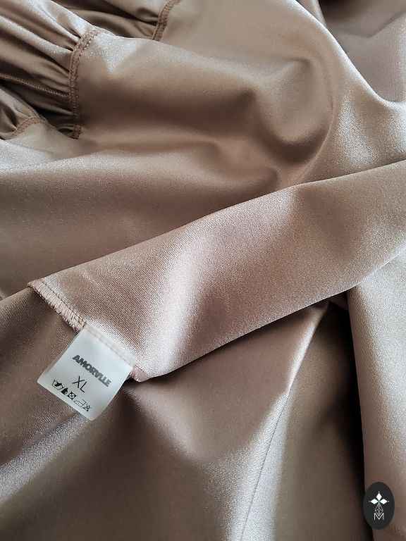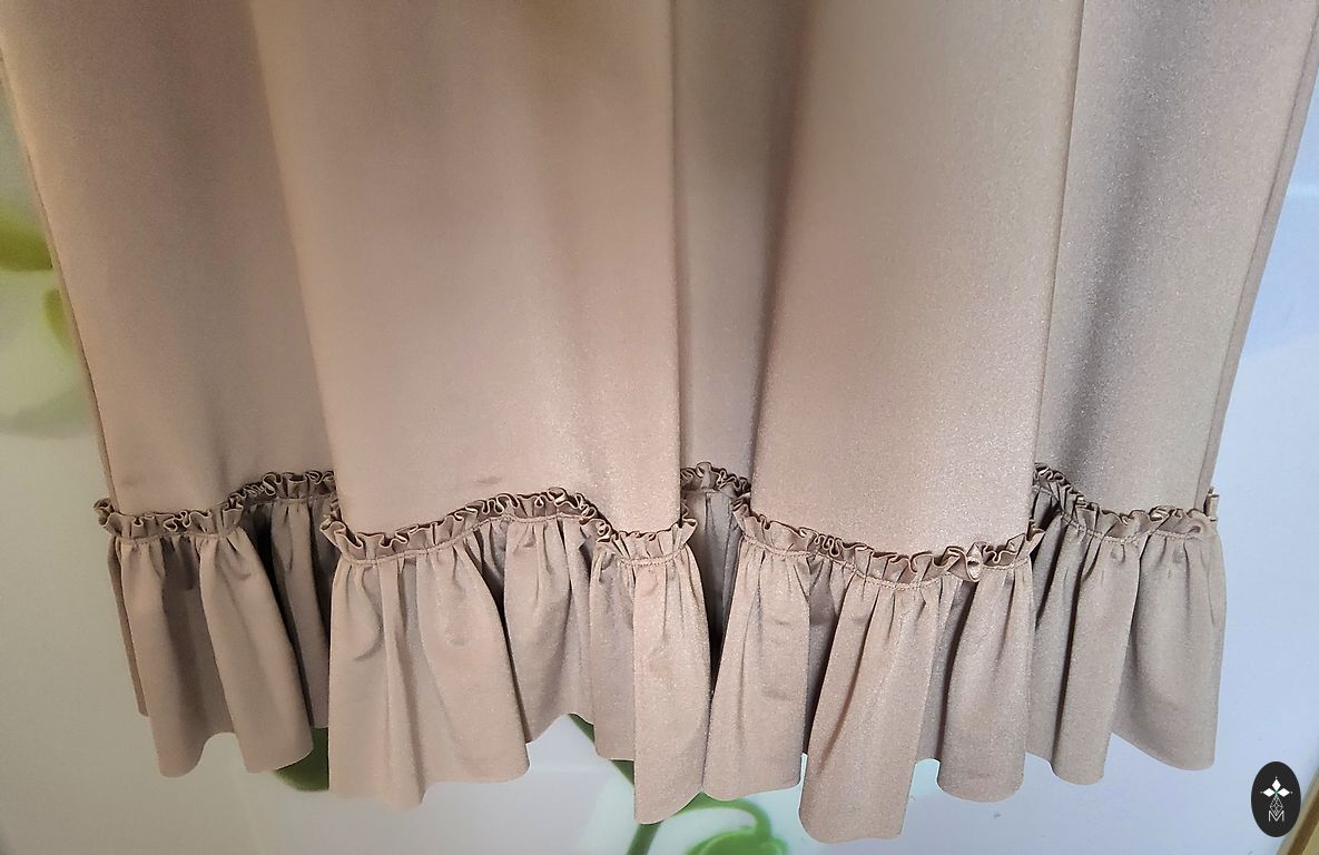 Pikkus 150 cm, rindkere kuni 90 cm, talje kuni 75 cm, puusad vabad, veniv kangas, ainult korra kantud.