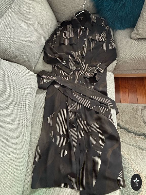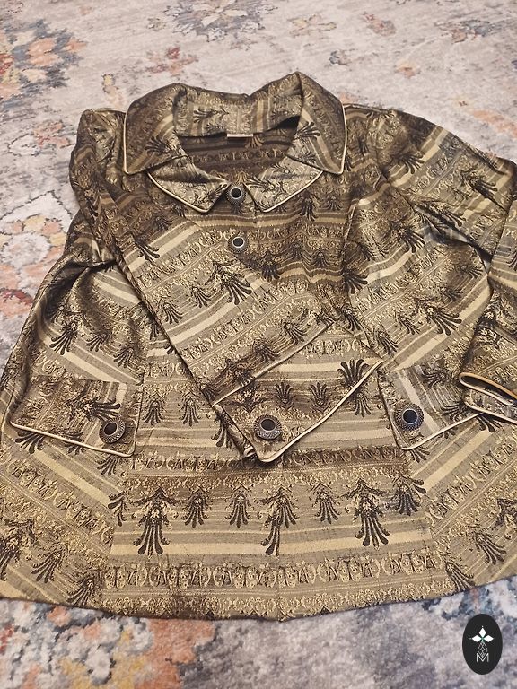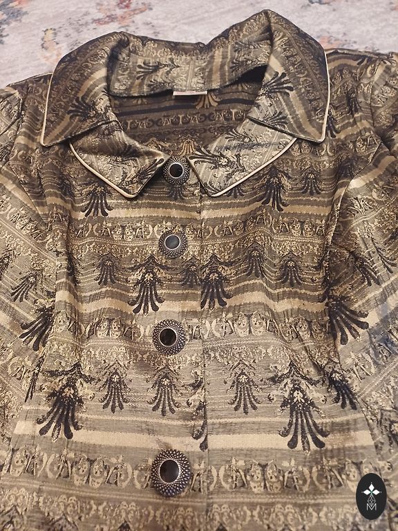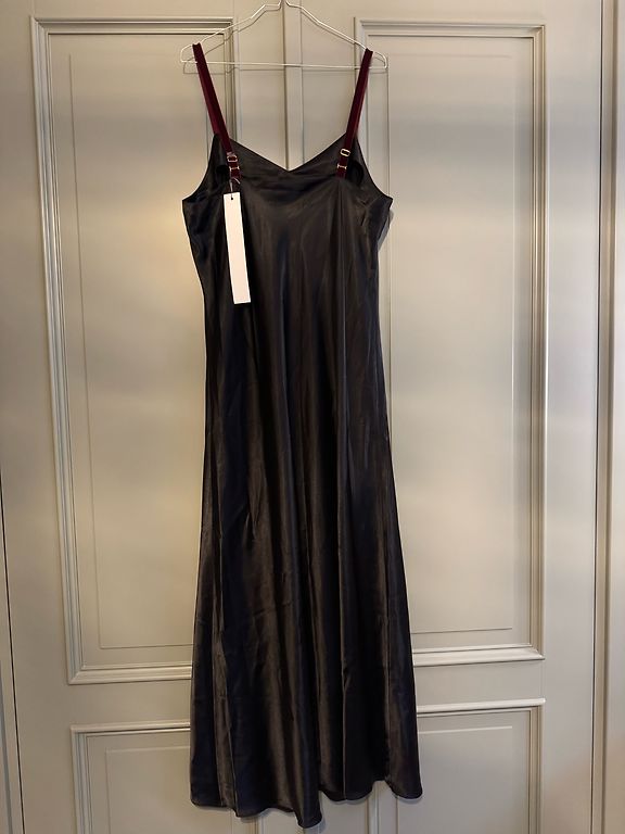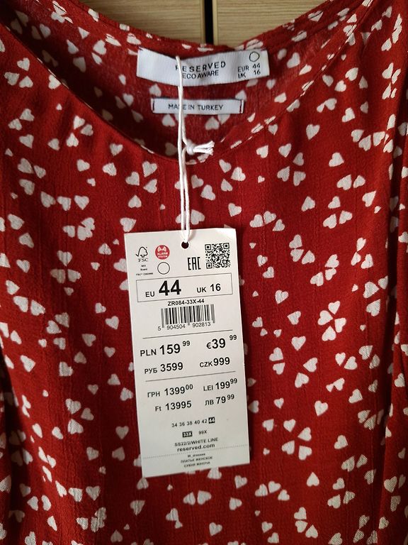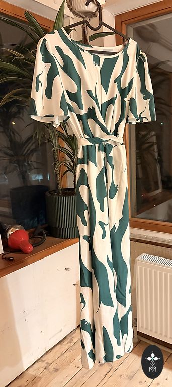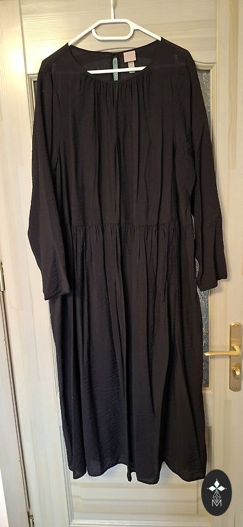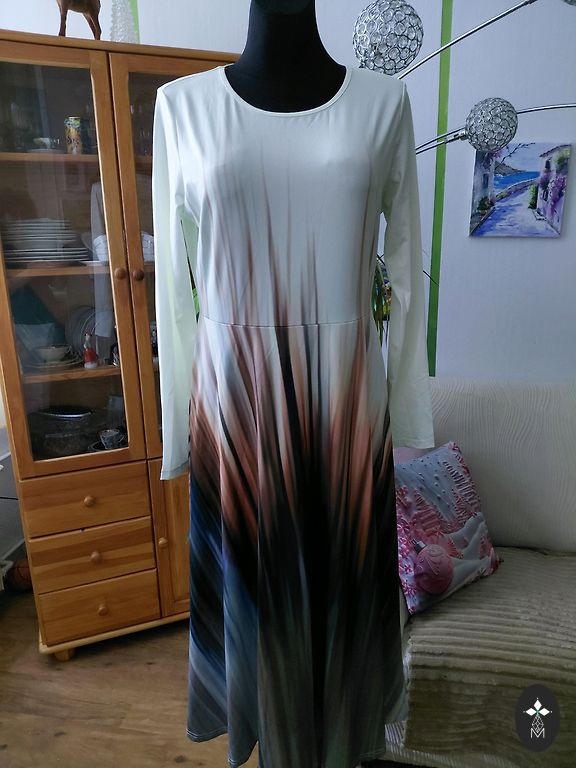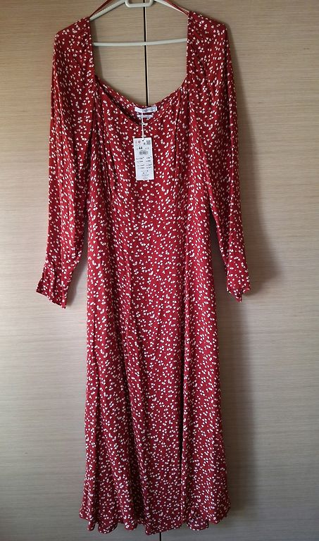 We are selling a beautiful dress with double flounces. Inside, there is a black cotton slip with adjustable straps. It fastens at the back with a button. The sleeves have ties at the bottom that can be tightened or loosened. The size is indicated as 42. The back length is 124 cm, bust - 108 cm, sleeve length from the neckline - 72 cm. The dress has never been worn, only tried on, and turned out to be a bit tight in the bust.