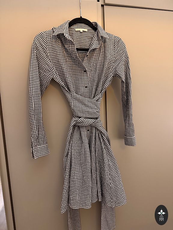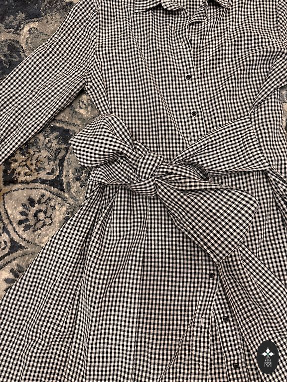 Apie suknelę: • Spalva ir raštas: balta su siauromis vertikaliomis juodomis juostelėmis – toks dizainas vizualiai pailgina figūrą ir suteikia labai klasikinį, rafinuotą įvaizdį. • Stilius: