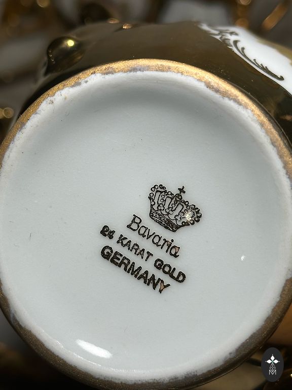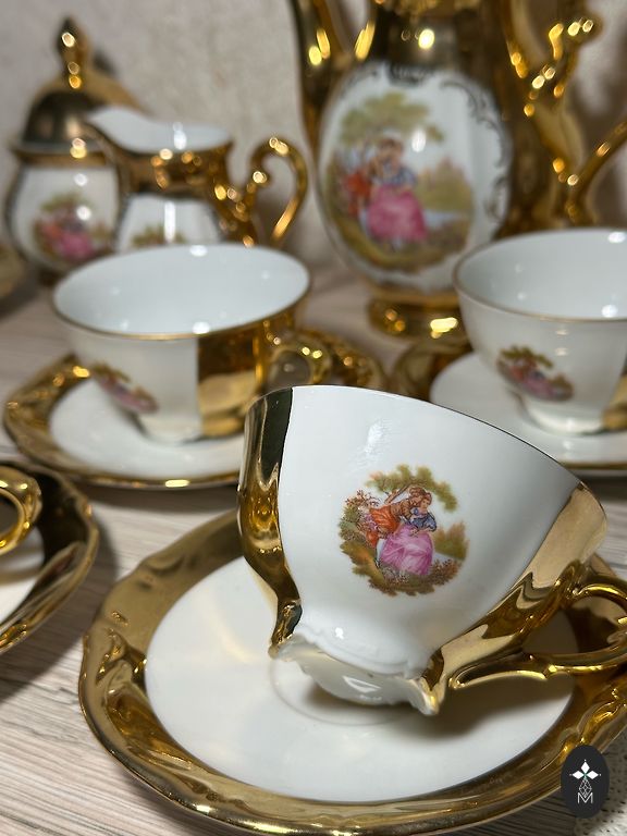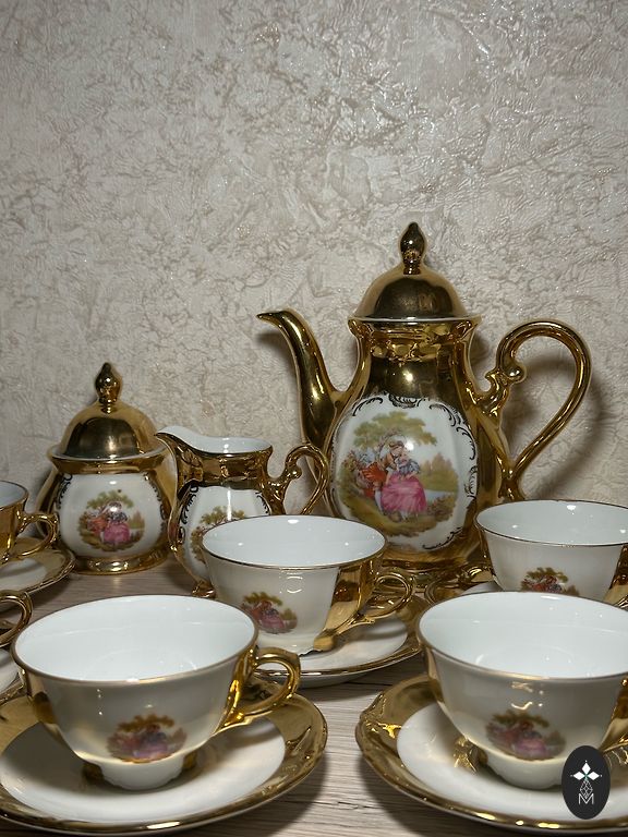 Beautiful, slightly used thin-walled porcelain coffee/tea set for 8 people. Porcelain manufacturer Tirschenreuth. All dishes are in excellent condition with no cracks or chips and no wear and tear.