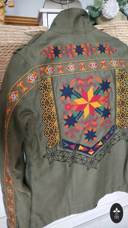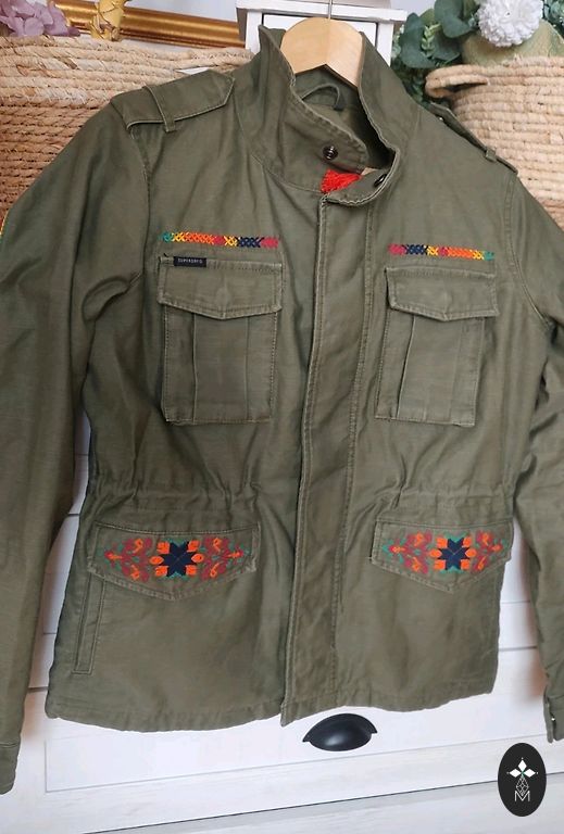 Pommitajajakiga tikitud liblikad. Vooder. Tumedad kuldsed tõmblukud. Funktsionaalsed taskud. Jakki alaosa, mansetid ja krae on kootud. Täiuslikus seisukorras. *Hind sisaldab Omniva pakiveo kulusid.