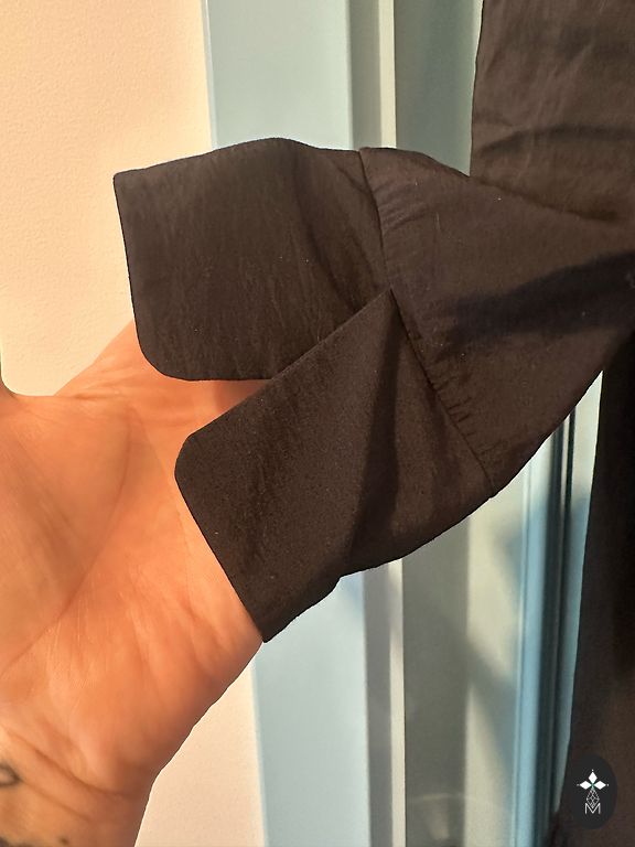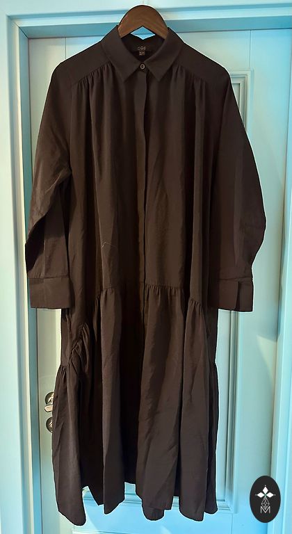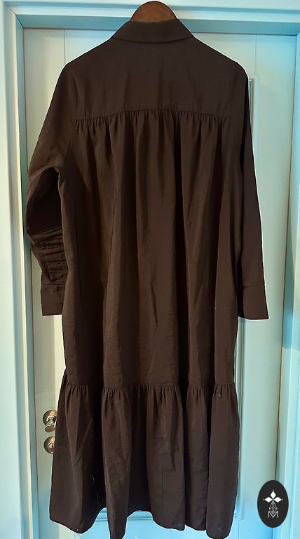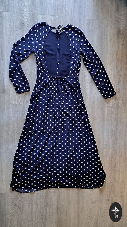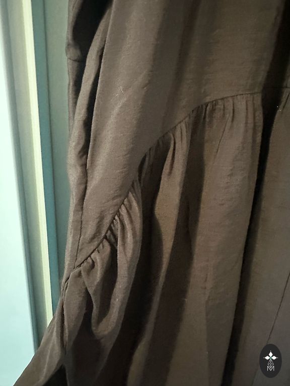 Etiketė nukirpta, nufotografuoti negaliu, neklauskite. Medžiaga nėra permatoma „pļurīga“, bet gerai krentanti. Matmenys: ilgis nuo peties 123 cm; nuo pažasties iki pažasties 58×2 cm; liemuo 50×2 cm.