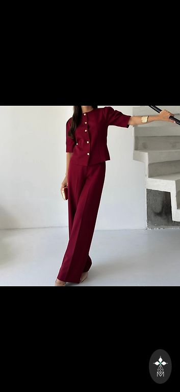 Premium klases kostīms no Polijas fabrikas EMO. Sākotnējā cena bija 125 eiro. Izmērs S, bet derēs arī SM un pat mazam L. Fabrika bieži šuj oversize apģērbus. Krūšu apkārtmērs līdz 110 cm, bikšu garums 107 cm, gurnu apkārtmērs līdz 108 cm. Biksēs ir kabatas. Dzīvē nav tik spilgts kā fotoattēlā, krāsa bordo (kā modelim pēdējā fotoattēlā).