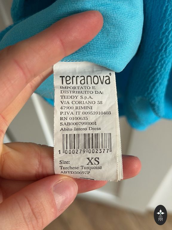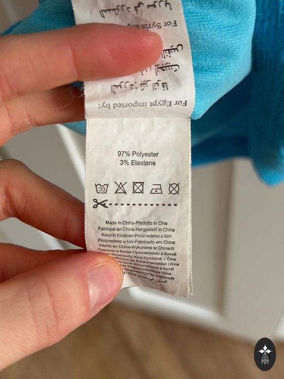 Dydis 36, bet buvo susiūta ties krūtine — geriau tiks 33 (XS) dydžiui. Etiketėje 100% poliesteris, bet audinys toks tvirtas taftas, stovintis tvirtai.