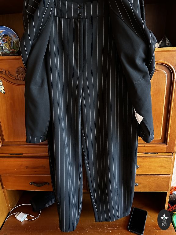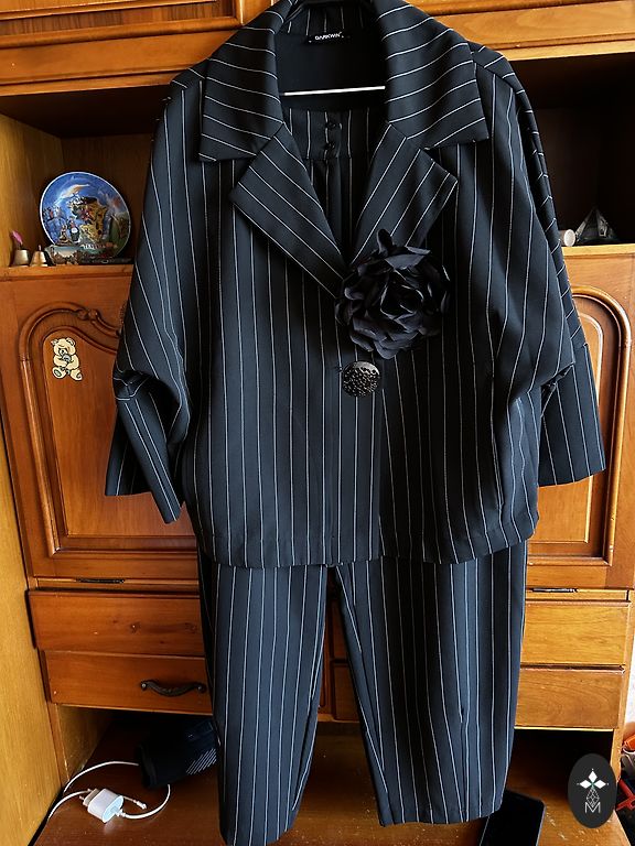 Жакет объем груди 106см,длина 69см,длина рукава 60см.Брюки сзади на резинке: объем бедер 110см,талия 77см, тянется до 96см,длина брюк 106см.Был надет один раз, piegāde 1.99