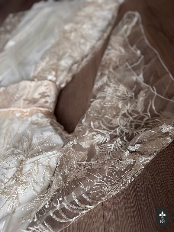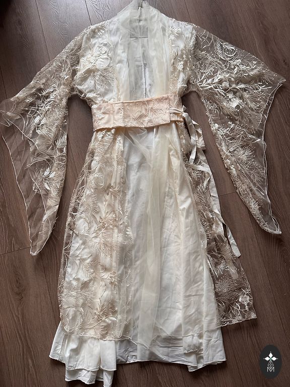 Dress uniquely enchanting - the top is pleated from the hips down, all pleated. Very stretchy, marked L, but would also fit XL. Sleeves are airy and charming, with a soft lining underneath.