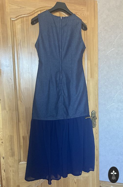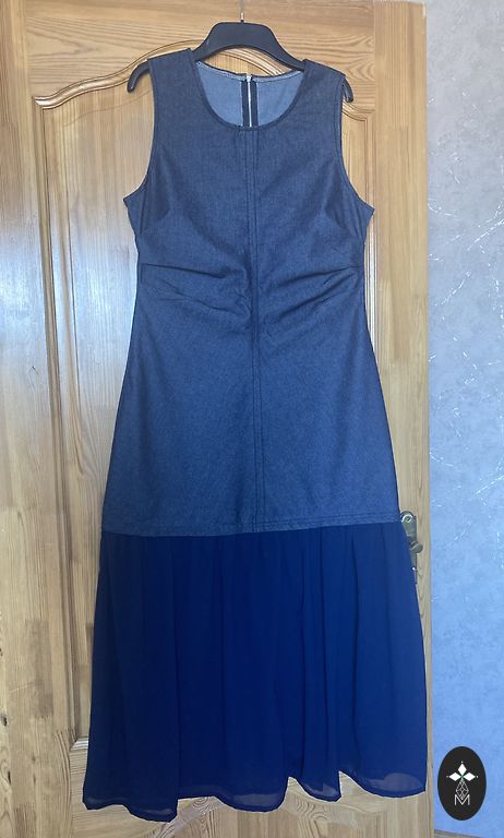 Lengvas džinsinis audinys, ilgis 88 cm, krūtinės apimtis 100 cm.