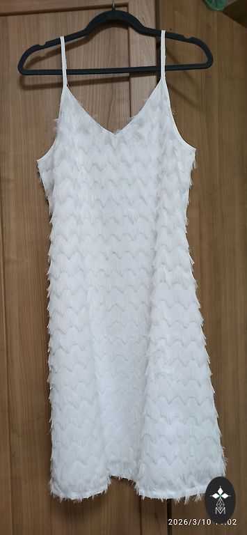 Kleit on ilus, maani. Sobib M/L suurusele. Värvid on rahulikud ja vaoshoitud. Talje ümber on vöö, alla poole kleit laieneb nagu merineitsi saba😉, varrukatel volangid. Taga on tõmblukk.