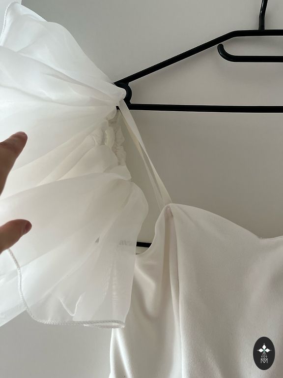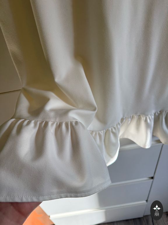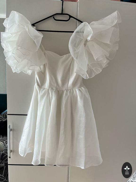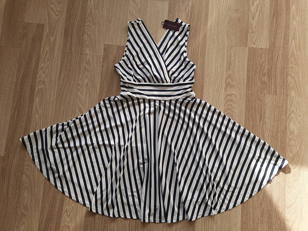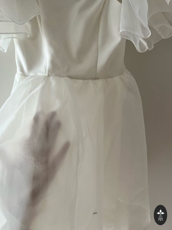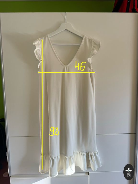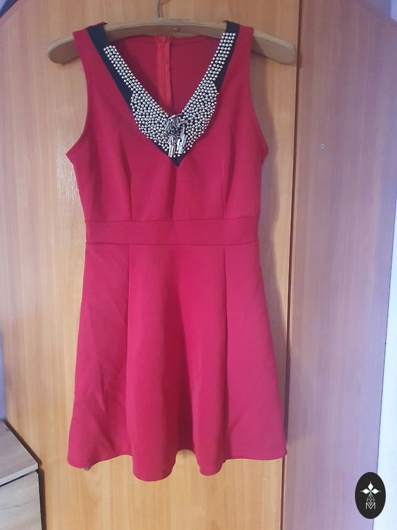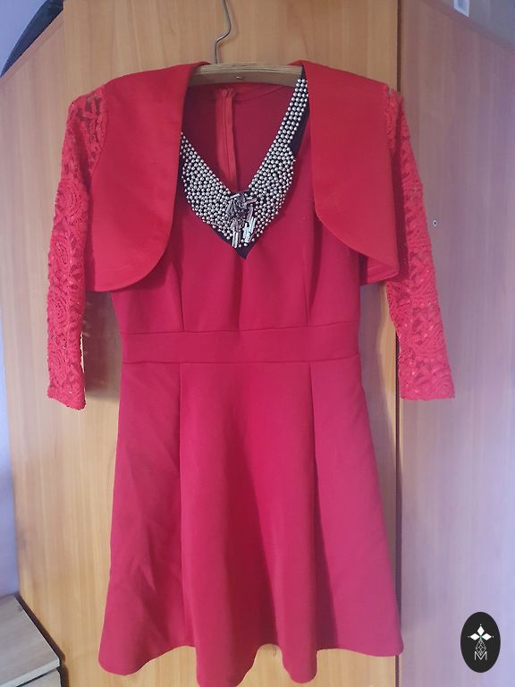 Oranžā/koraļtoņa izejamā kleita ar zelta krāsas ornamentu priekšpusē. Garums 80 cm. Platums viduklī 30 cm. Audums stiepjas ļoti minimāli.