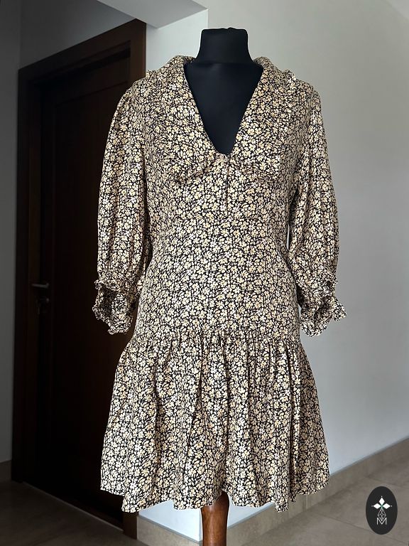 Parduodu 1 kartą per šventes dėvėtą suknelę. M dydis. V formos iškirptė, puikiai atrodo dekoltė. Rankovės 3/4, rankovių apačioje elastinės gumos.