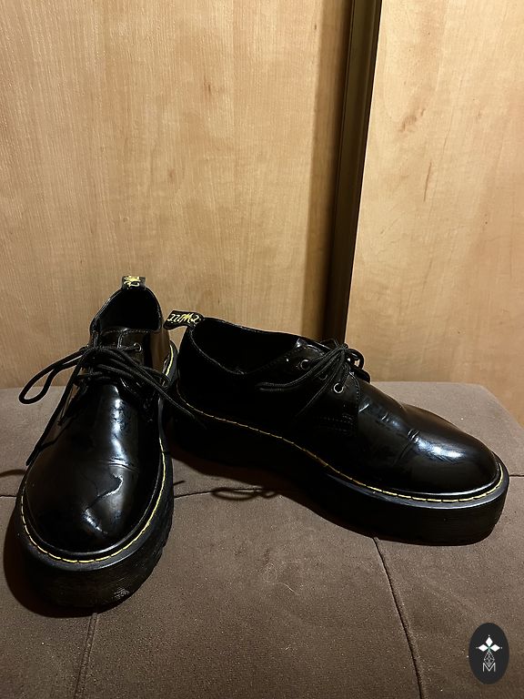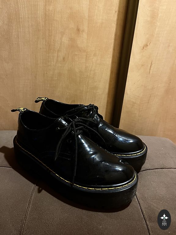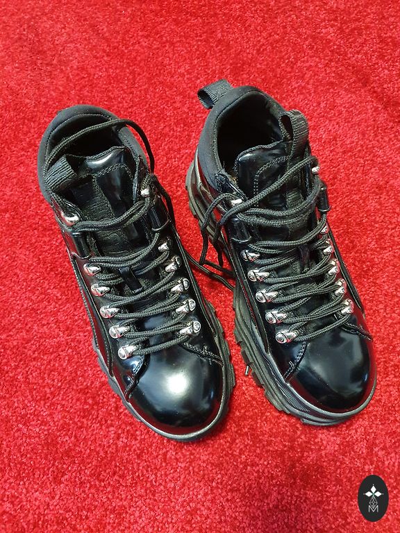 На последней фотографии виден дефект: на передней части одной туфли на коже небольшое царапина. Внутренняя подошва 25 см, платформа спереди 2 см, каблук сзади 9 см, самая широкая часть подошвы 9 см. Размер обуви указан как 40.