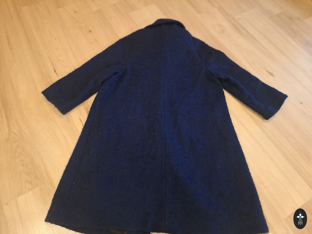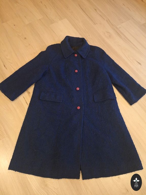 Темно-синий пальто. Очень хороший состав ткани. Есть 2 недостатка (видимы на последних 2 фото) — отслоившаяся кожаная отделка на задней части воротника и поясе. Если не ставить воротник вертикально, то это не заметно и не мешает носить. Можно носить и без пояса, или прикрепить другой Других недостатков не вижу, рука не поднимается выбросить. Может быть, кому-то еще пригодится, потому что пальто было удобным и теплым Цена чисто символическая