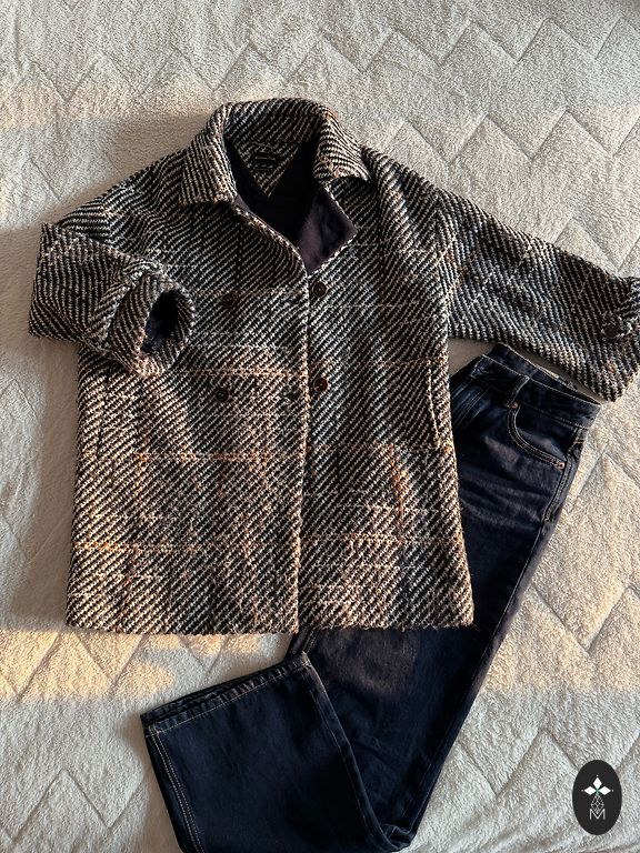 Skaists rūtains mētelis rudenim, sastāvā 68% vilna, 15% mohēra. Vilkts dažas reizes.