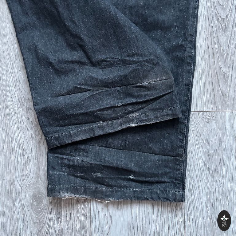 Pelēkas džinsu bikses ar skaistiem uzšuvumiem. Audums nav īpaši staipīgs.