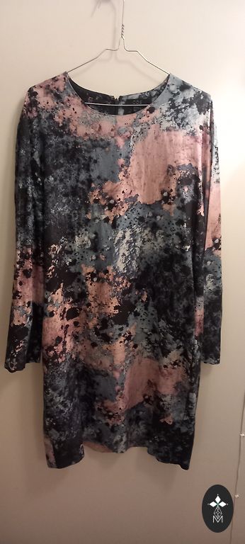 Suknelė su įpjovomis abiejose pusėse, lengva, patogi, su gražiu gėlių raštu. Ji turi kišenes ir diržą. Šonuose esančiose įpjovose buvo siūlai, kuriuos siuvėja sutvarkė. Krūtinė 51×2 Juosmuo 52×2 Klubai 56×2 Ilgis 1,25