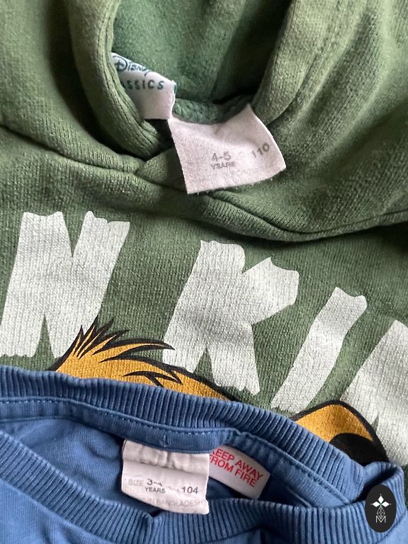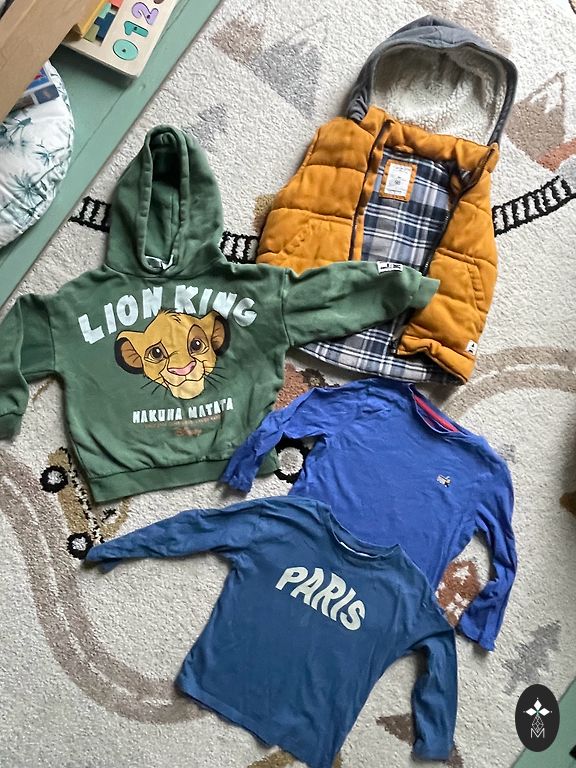 Peleks reserved teddy bombers un h&m džīnas. Reserved jakai 110, bet galīgi nelikās. Vilkām, kad nēsājām 104 izmēru, un bikses arī vilkām ap 104 izmēru