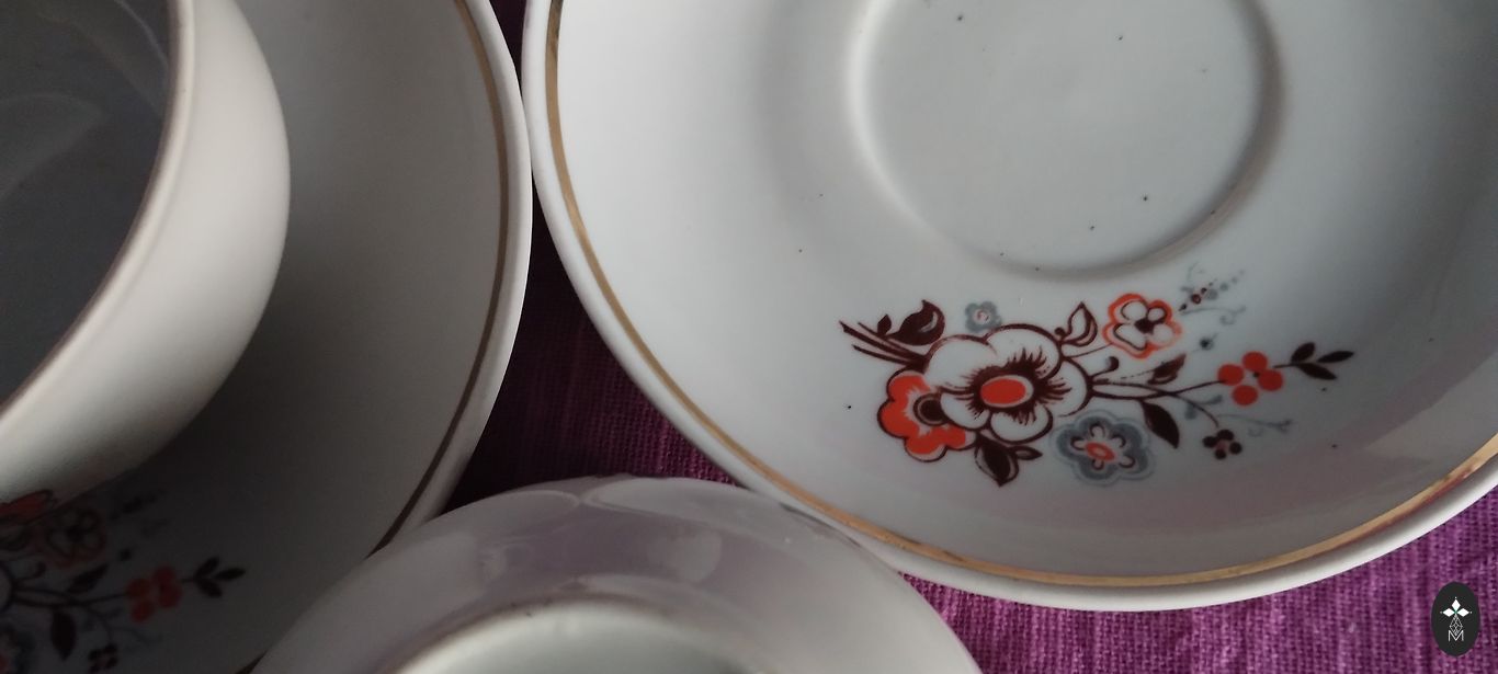 Frīdriha Kestneri portselanitehase teeninduskomplekt 4 inimesele on loodud juugendstiilis, mida näitavad nii nõude kujud kui ka lillemotiiv (rukkilille ohakate õied?). Käsitsi joonistatud. Templiga portselanimassis.