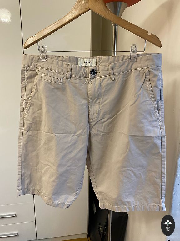 Vīriešu plāni vasaras šorti ar kabatām. Aiztaisās ar rāvēju, podziņu un aukliņām.