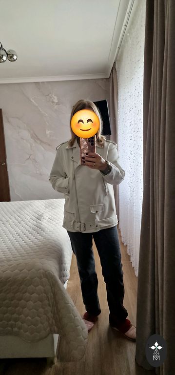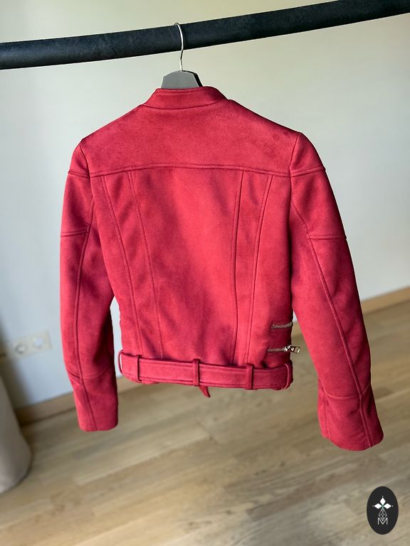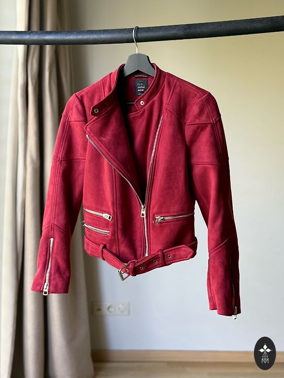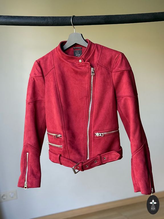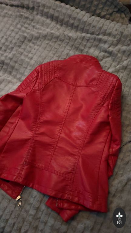 Красная кожаная куртка, красиво смотрится на фигуре, не останешься незамеченной:) хотя указан размер M, все же свободнее будет на размер S.