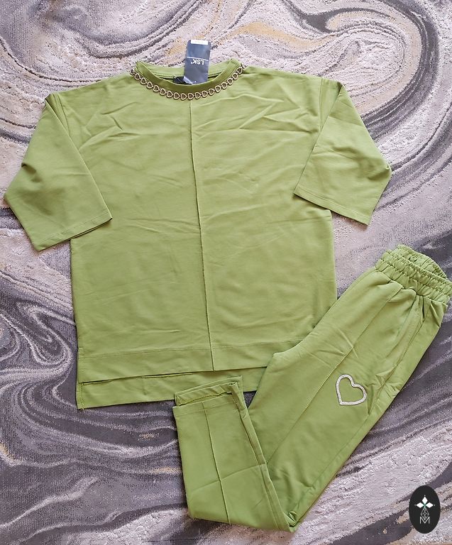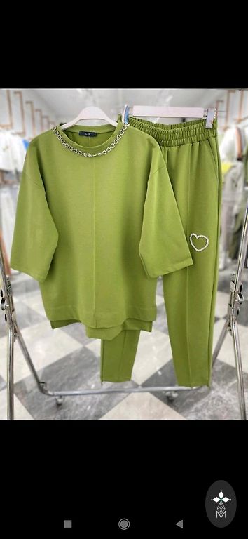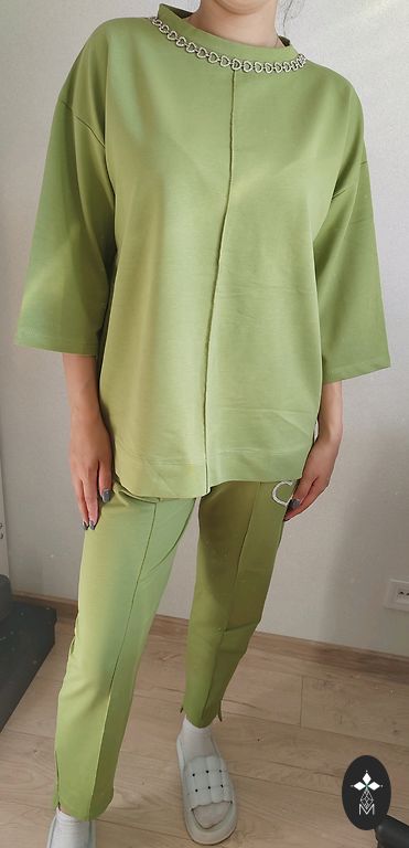 Superīgs zaļš kostīms. Nav plāna auduma,bet mazliet biezāks. Veste ar oderi un kabatām,svārki ar oderi un rājvējslēdzēju sānos.